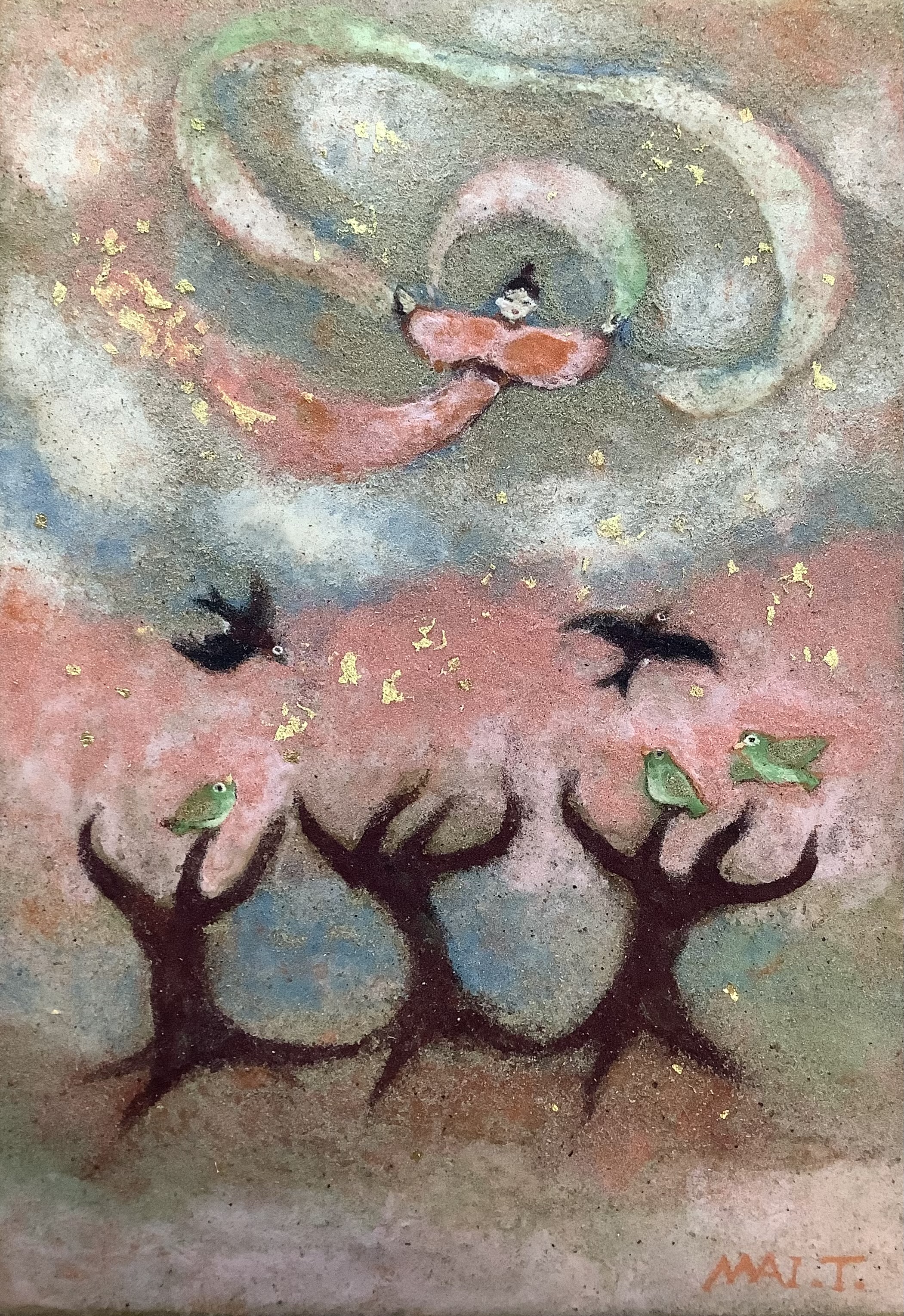 おうか、は「謳歌」でもあり、桜をたのしむ天女や小鳥たちの絵ですね。
