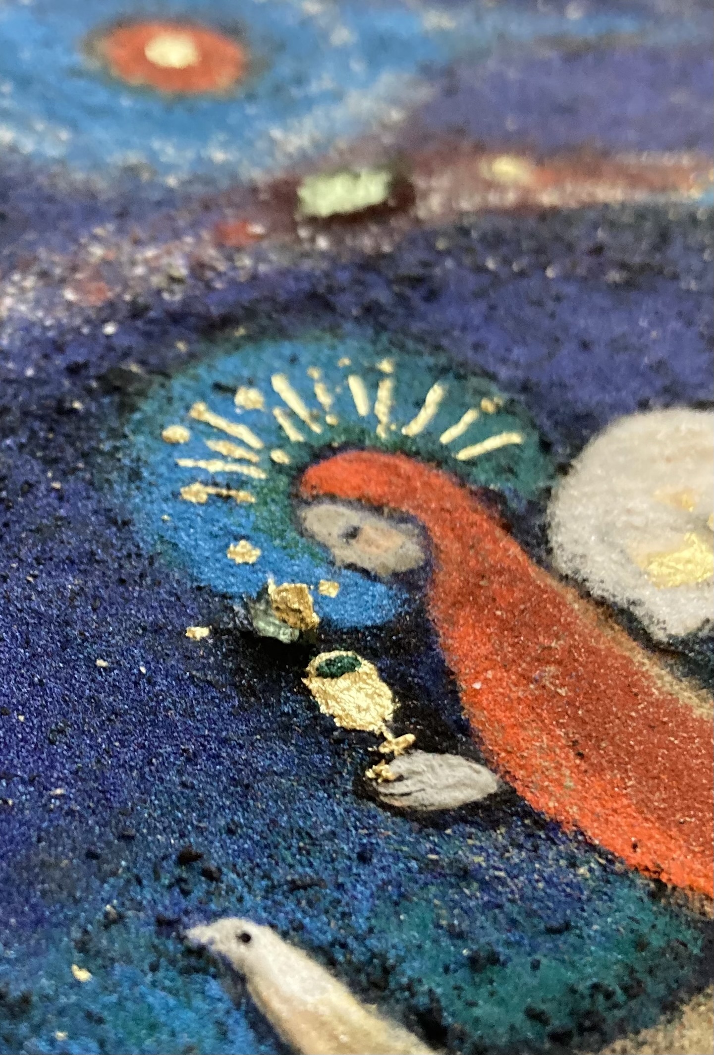 天使の頭上、薄緑に反射している四角っぽい石がそうで、あとは盃の上、湯気のようなオーラのような部分に、同じ石のカケラを配しました。さりげなく、ですが「モルダバイトの聖杯」をイメージしています。