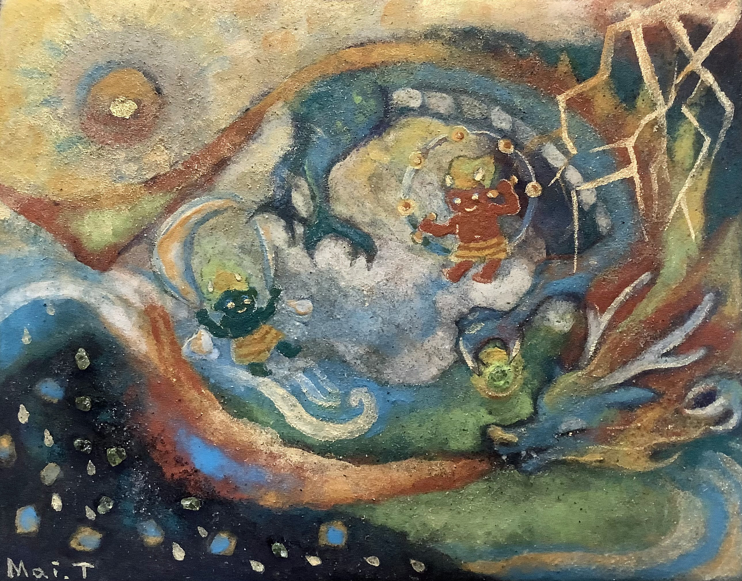 この絵は、小さい作品なのに賑やかな画面に仕上がり、タイトルを決めるときと、お迎えいただいた方の元へ行くとき、明確に喋ってきた感じ(テレパシーのような…)が二度ありました。