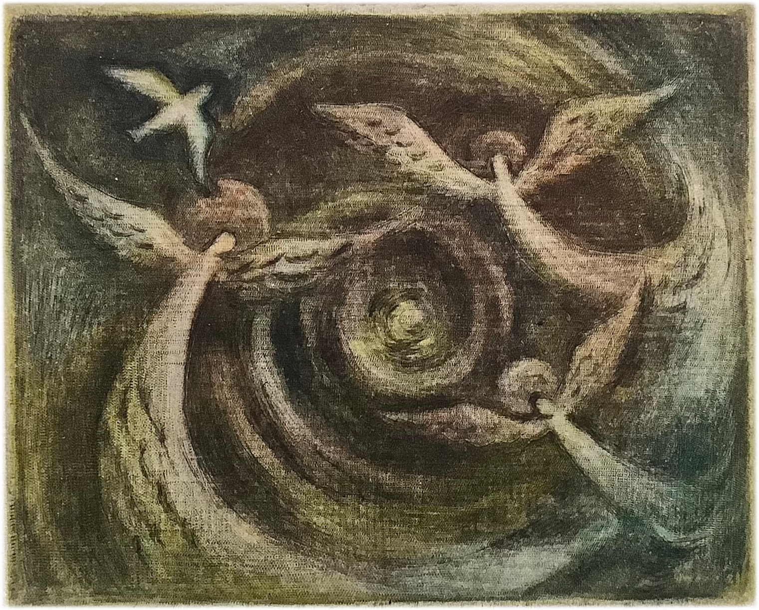 一版多色刷りで、虹の中を舞う天使を描いています。