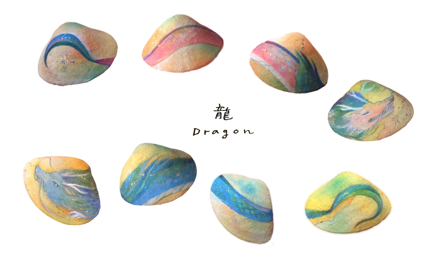 龍の力強さ、躍動感を表したいと思って、からだを4つの貝がらに分けて描いています。