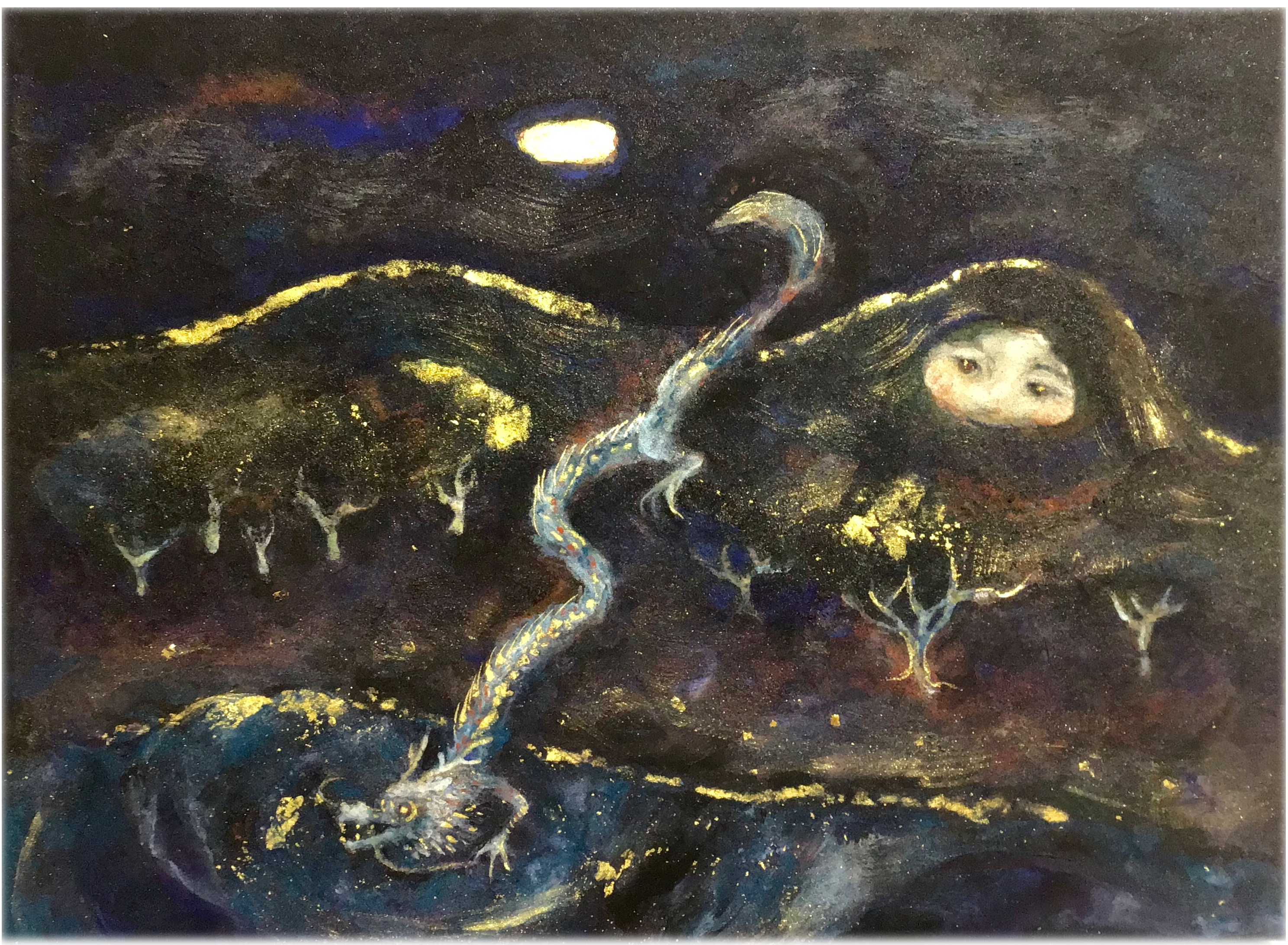 …という物事の成り立ちを思いつつ描いた絵。山や海がどういう風にできたかということ。 土には意思があって山になり、海の始まりは空から降った水(龍)だった…みたいな物語、でしょうか。 岩絵具では初めて描いた龍は、下書きの時はいなかったモチーフです。 もともとは海に注ぐ川のようなイメージでした。 制作中に読んだ本が、木村秋則さんによる『すべては宇宙の采配』という本で、この方はリンゴ畑で龍を見たことがあるそうです。 「彼らは人が認識できない時間を行き来できるのかも……」ということで、そういう邂逅を絵にできたらと思って描き進めました。 |